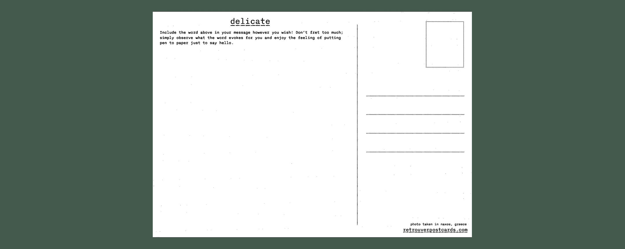 To help you get creative with it, one randomised prompt word has been placed at the top of each postcard for you to use and incorporate into your message however you wish: recount a shared memory, delve into something you've been thinking about recently, or simply describe the view from your window.Don’t fret too much; just see what images the word evokes for you and write whatever comes next down.The prompt word on the postcards is just a stepping stone: the rest of the message is for you to find.